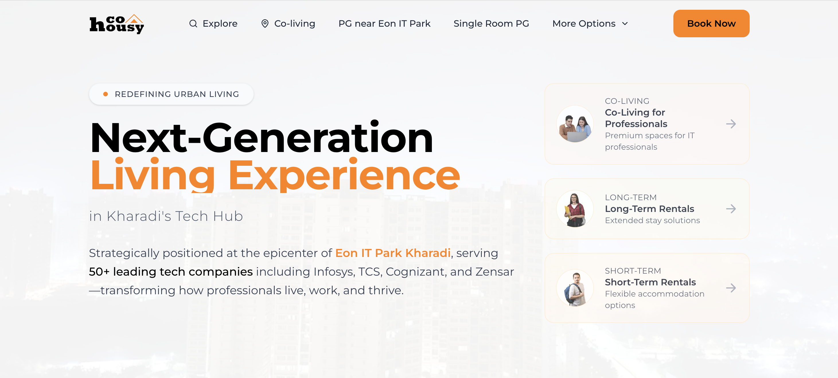 Cohousy: An IT-hub specialist offering managed rooms with a "walk-to-work" promise near Eon IT Park and World Trade Center, Kharadi.