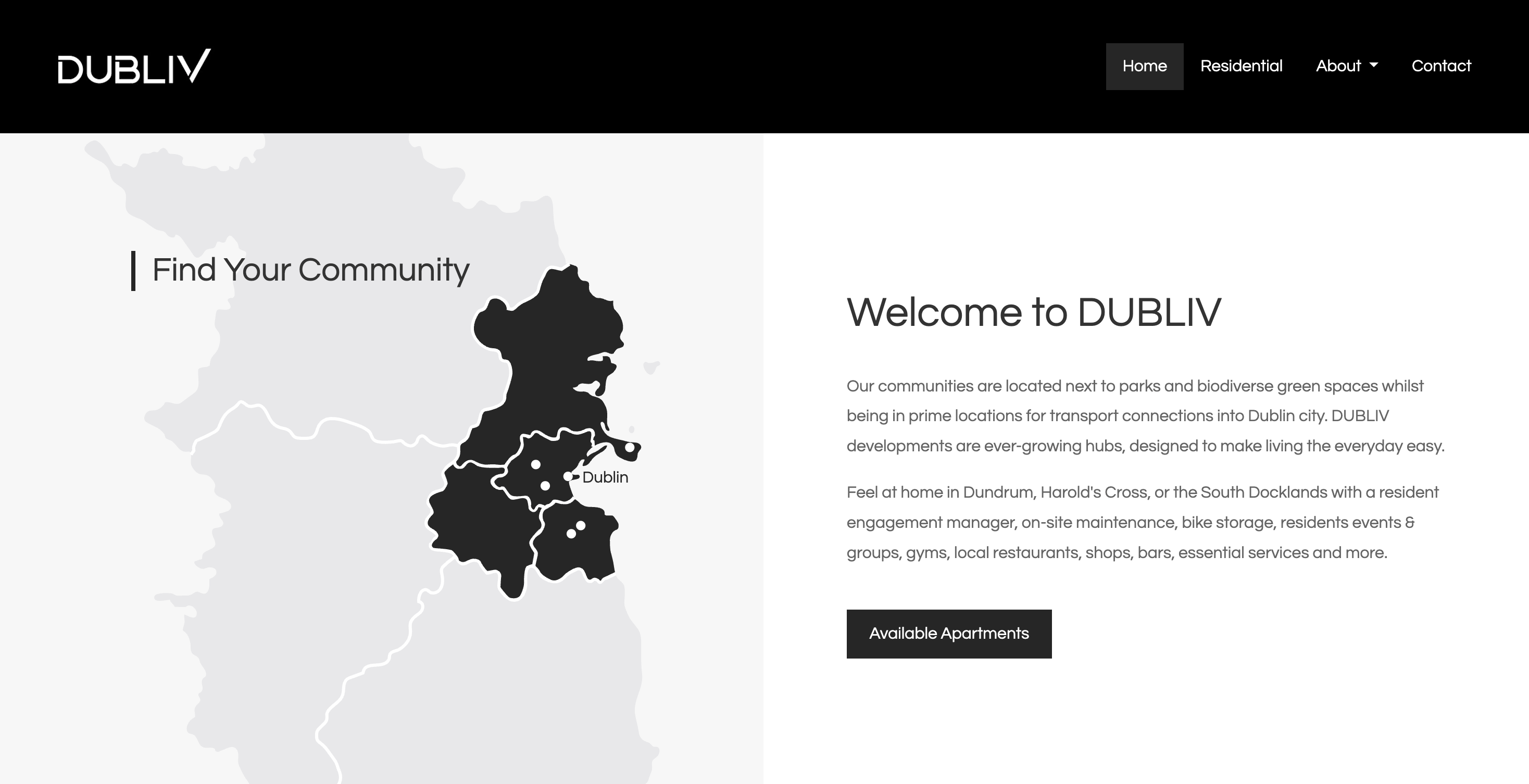 DUBLIV: Large-scale rental communities with gym and lounge amenities.