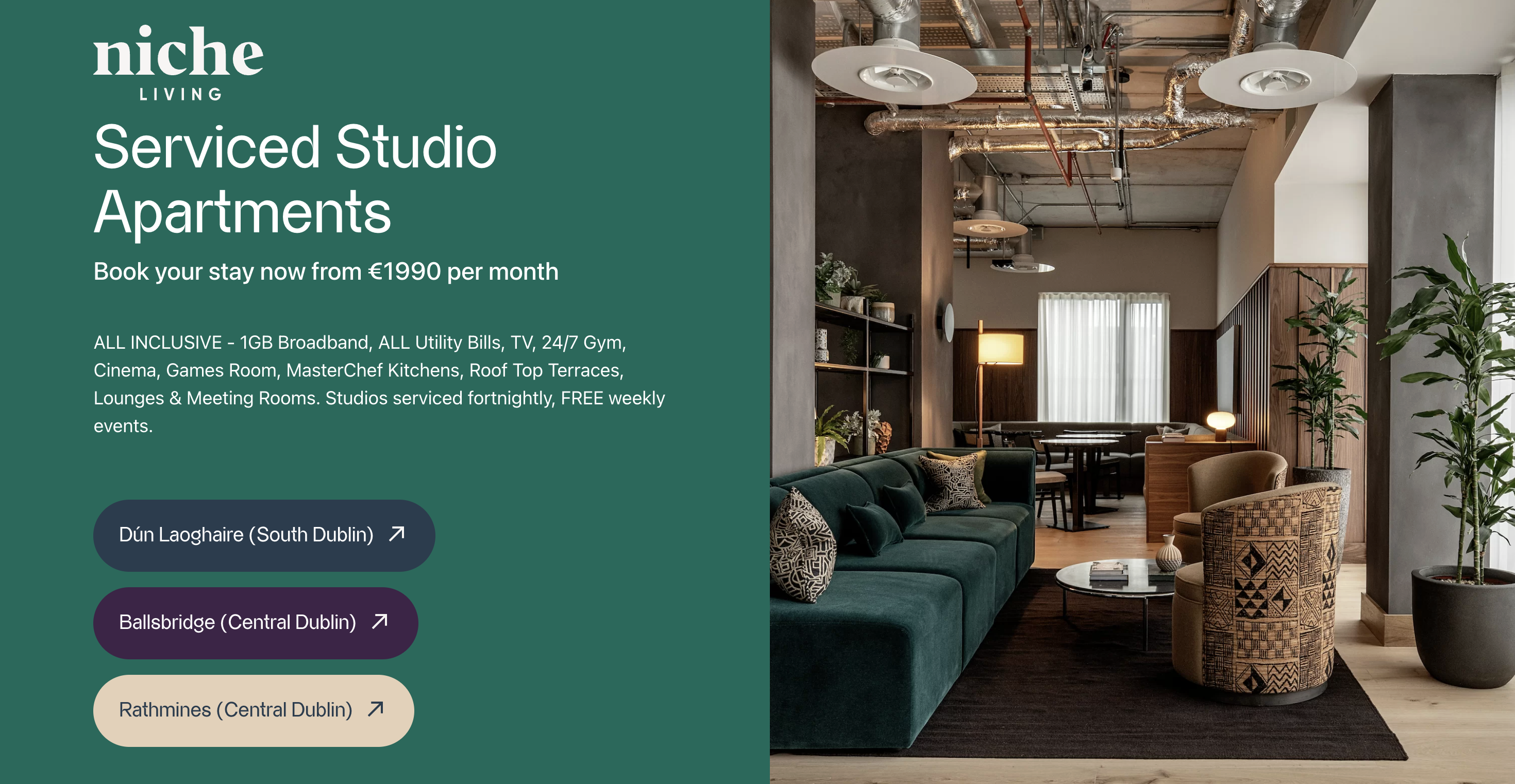 Niche Living bridges the gap between a boutique hotel and a coliving space. They offer "serviced studio apartments" that are fully equipped with kitchenettes, but the real value is in the shared building amenities. Their Dun Laoghaire location is particularly special; being on the coast, it offers a lifestyle that city-center blocks can't match - sea swims at the Forty Foot, walks on the pier, and fresh air. Inside, the "MasterChef" kitchens allow residents to host dinner parties that wouldn't fit in a studio.